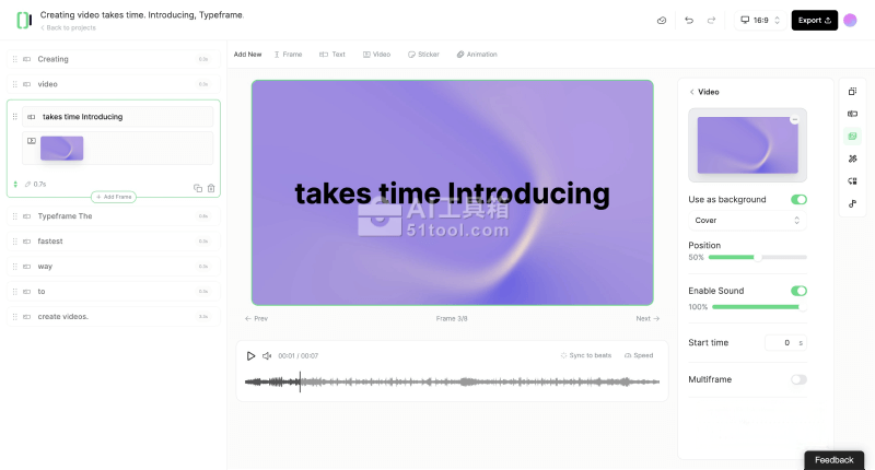 - 文本到视频转换:Typeframes的核心功能之一,允许用户输入产品介绍文本,然后平台会自动将其转换为视频。这个过程中,用户可以选择不同的视觉效果和动画来增强文本的表现力。