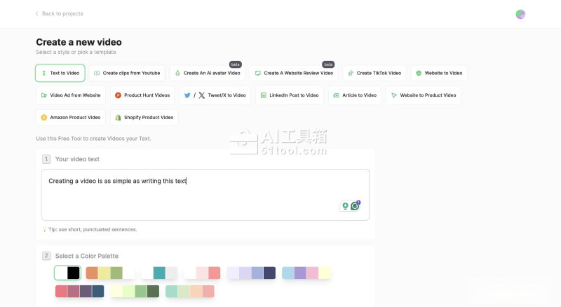 - 选择Text to Video或其他视频生成模版,输入视频文案脚本、选择颜色主题和背景音效