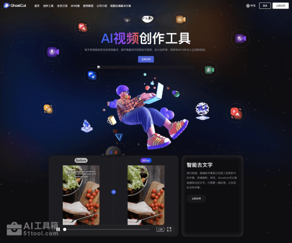 鬼手剪辑(GhostCut)是一款集成了人工智能技术的智能视频剪辑工具,可帮助用户快速去除视频中的文字、进行视频二创去重、自动翻译视频文字和语音、以及视频擦除等操作。用户可以轻松地通过网页版或微信小程序使用这些功能,提高视频编辑的效率和质量。此外,GhostCut还提供开放的API接口,方便第三方产品集成使用。