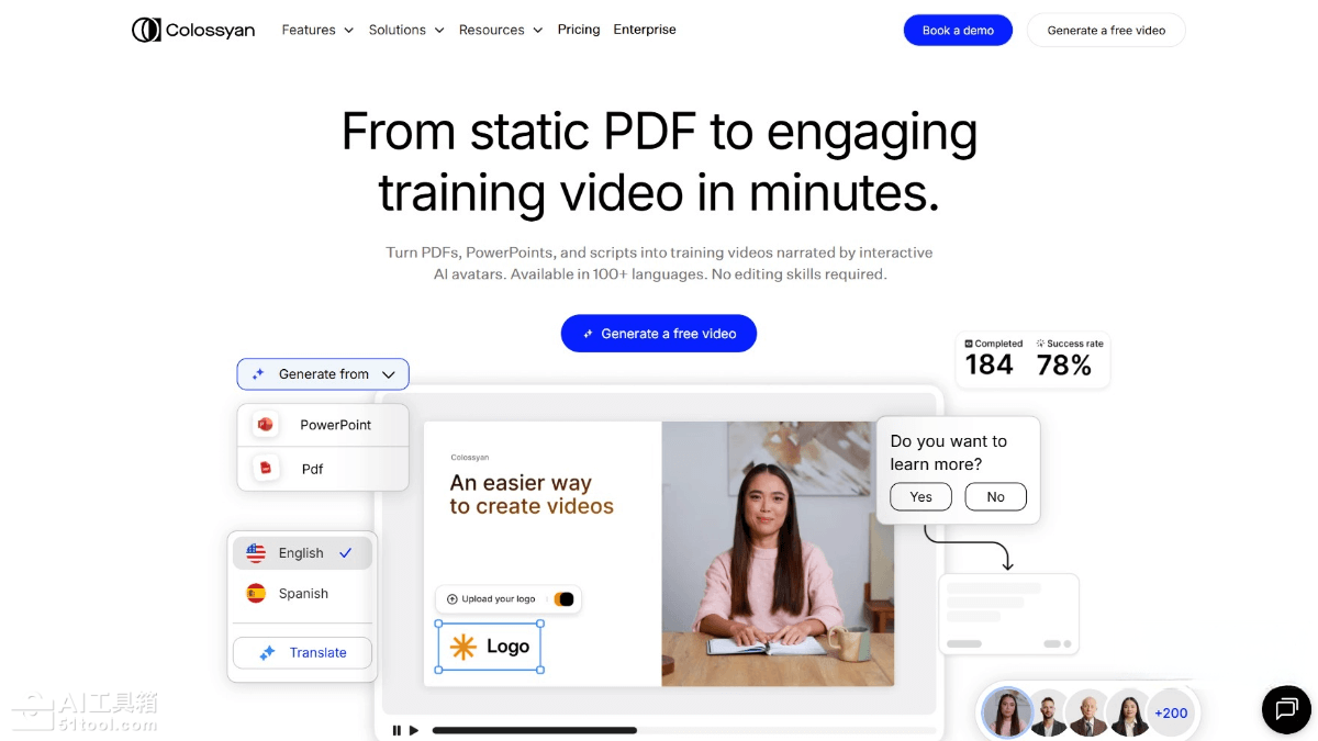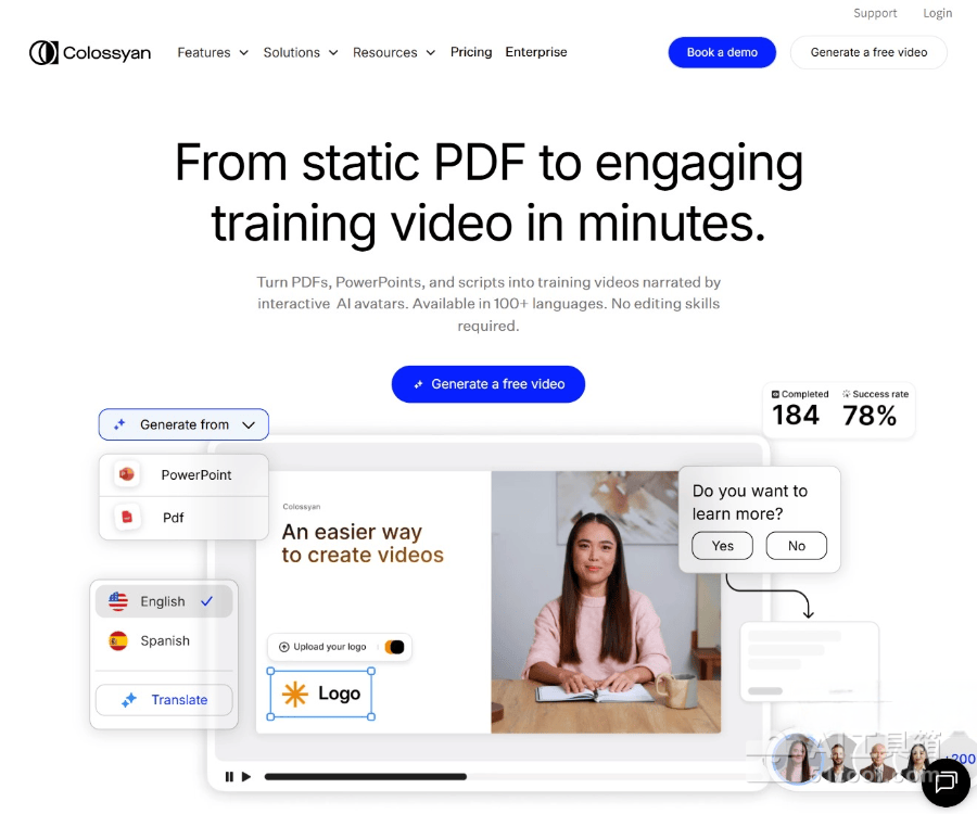 Colossyan 是 AI 数字人视频生成平台,支持将 PDF、PPT 和脚本等快速转换为由 AI 虚拟形象配音的视频,支持 100 多种语言。平台无需专业编辑技能,操作简单,提供多种数字人形象、语音选择和视频设计功能,能添加互动元素和自动翻译,适合产品介绍、培训等多种场景,显著节省制作时间和成本,助力企业和团队高效产出个性化、多语言的视频内容。