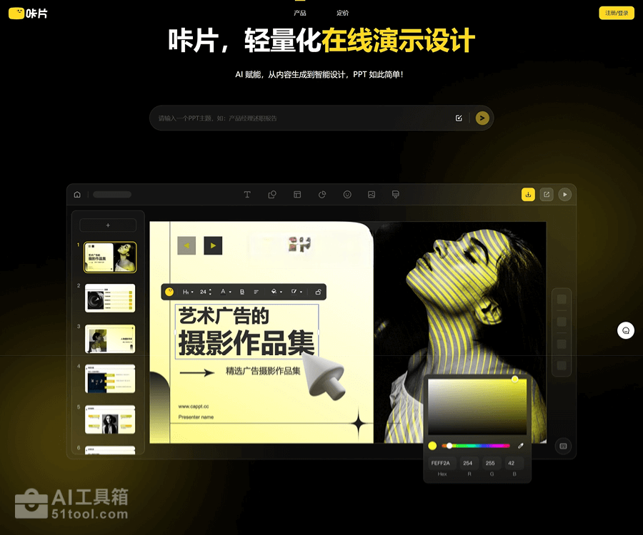 咔片PPT是AI在线PPT制作工具,能实现从内容生成到智能设计与美化的全流程自动化。用户输入主题或关键词可快速生成完整的PPT框架,AI辅助内容写作,提供扩写、精简、润色等功能,一键换肤智能美化,内容与样式独立,主题设计风格可一键调整。新建单页AI设计,仅需提供标题描述或文案,AI自动完成PPT页面设计。简化编辑排版,减少重复编辑工作量,支持PPT下载,与WPS与Office高度兼容。