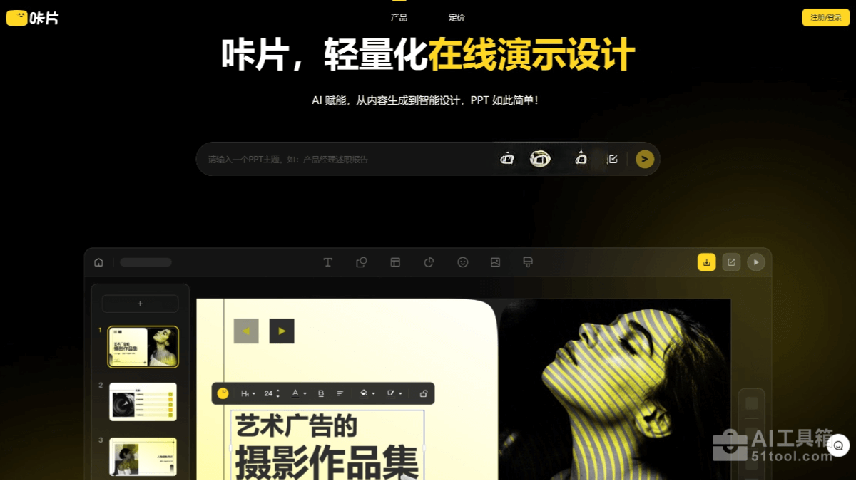 - AI一键生成PPT:用户只需输入主题或关键词,咔片能自动生成完整的PPT框架,包括标题页、内容页、结尾页等,提供多种风格和主题的模板,用户可以根据需求选择合适的模板,无需从零开始设计。