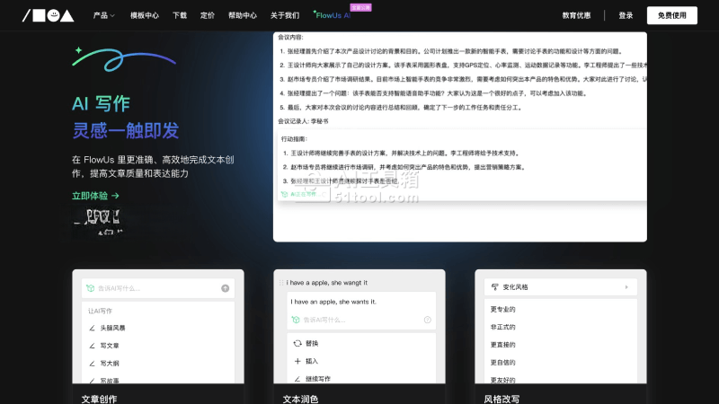 - 翻译与多语言处理:FlowUs AI 支持多国语言互译,快速翻译文本并提供语言风格改写,促进跨文化交流。