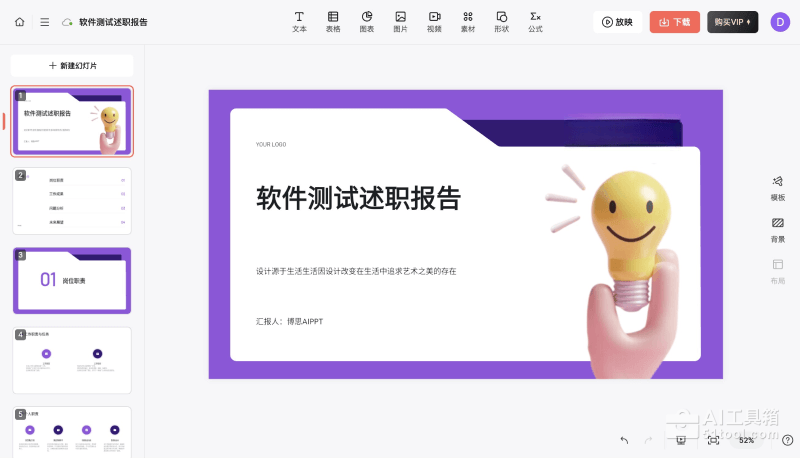 博思AIPPT是一款创新的在线AI驱动的PPT制作工具,由博思白板背后的博思云创公司精心打造,提供了多样化的快速PPT创作途径,包括基于主题的PPT生成、文本驱动的PPT制作,以及从Word、PDF、TXT、Markdown等文件格式导入内容生成PPT。软件内置了丰富的、设计精美的PPT模板库,覆盖了商务、教育、科技等多个领域,满足用户个性化和多样化的需求,确保每次使用都能带来全新的体验。博思AIPPT还针对每个PPT页面提供了多种布局选项,支持一键智能适配,确保演示文稿在各种办公场合下都能完美呈现,为需要高效制作专业演示文稿的用户提供了一个强大的助手。