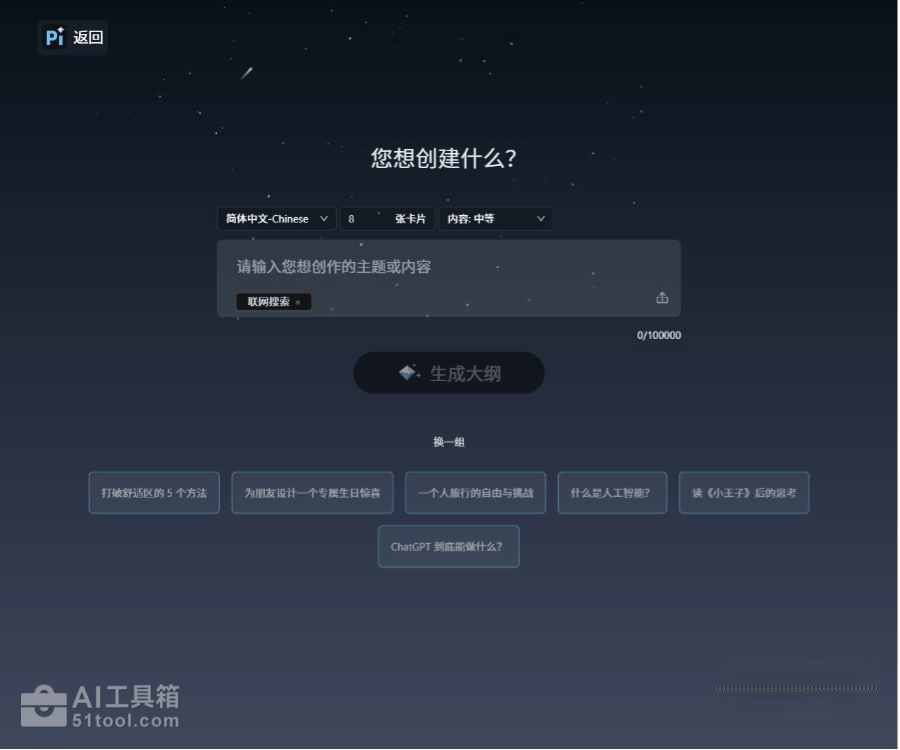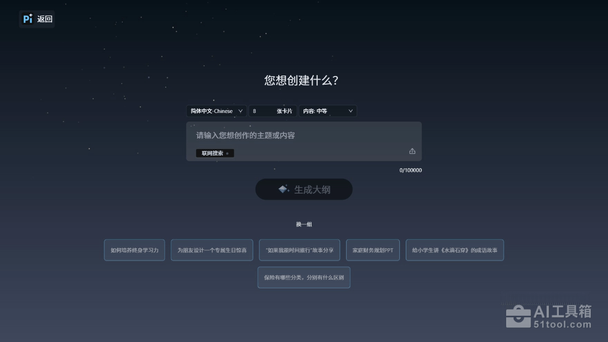 智能生成演示文档:用户输入文本、上传文档或URL,Pi能自动生成专业美观的演示文档。