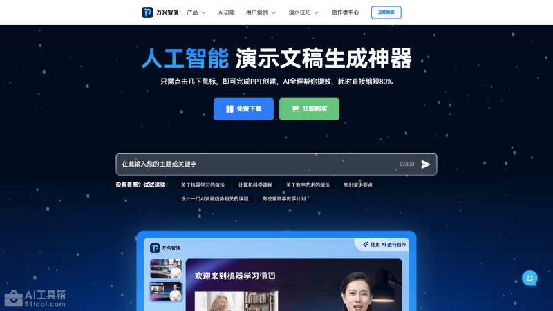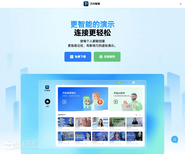 万兴智演是由万兴科技推出的AI PPT和演示制作软件,利用人工智能技术简化演示文稿的创建过程。用户只需输入主题和关键信息,AI即可自动生成演示大纲和内容,提供丰富的个性化模板和资源选择。此外,万兴智演支持一键录制和流式传输演示文稿,内置提词器功能,帮助用户实现流畅的演示体验。该工具适用于知识分享、企业培训、在线教育等多种场景,旨在提升演示效率和互动性。