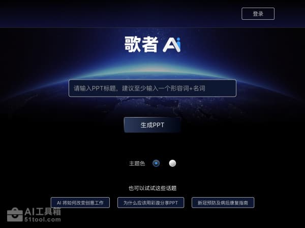 - 输入主题:在歌者AI的界面中,输入你想要生成PPT的主题或大纲。