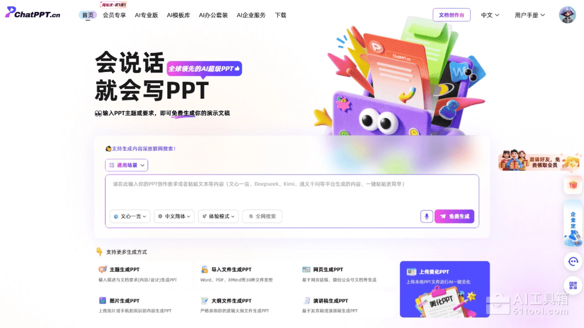 - AI生成PPT:输入主题或要求,ChatPPT快速生成完整的PPT演示文稿。