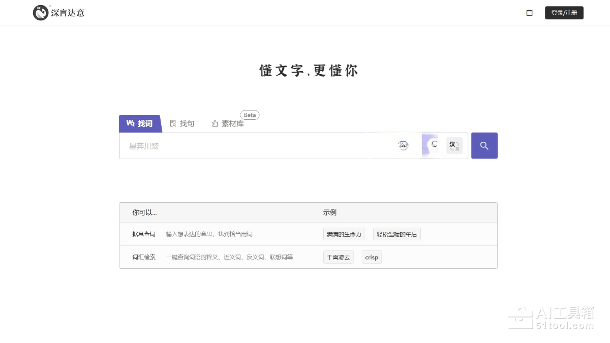 深言达意是免费的词句查询智能写作辅助工具,由清华大学自然语言处理实验室和智源研究院孵化的人工智能初创公司深言科技研发推出。工具融合了此前该团队推出的WantWords反向词典和WantQuotes据意查句两款神器进行了整合升级,支持据意查词、据意查句、语料查询等多种功能。基于强大的自然语言理解和机器学习算法能力,只需输入模糊描述,深言达意便能快速找到合适贴切的用词用句,助力创作者文思泉涌,妙笔生花。