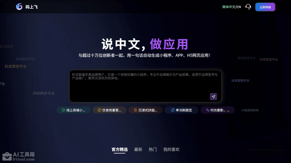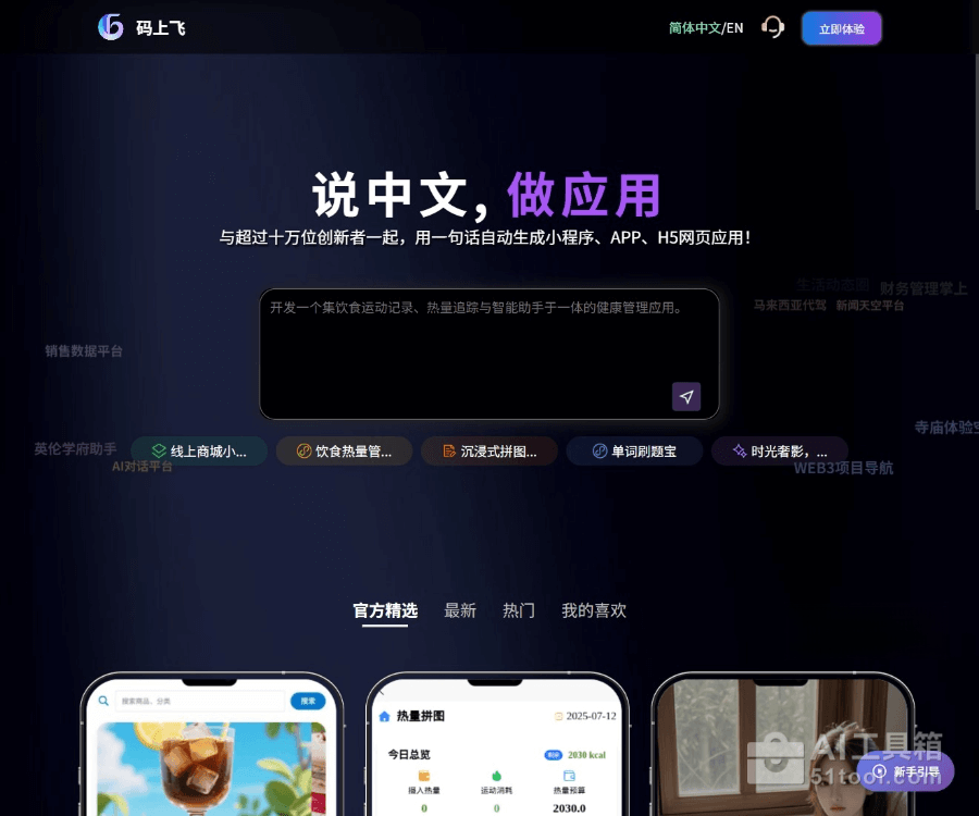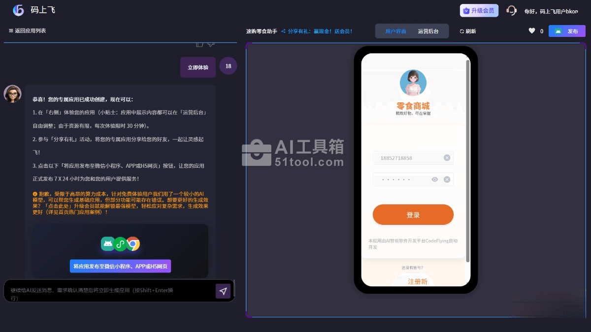 码上飞(CodeFlying)是跨赴科技推出的零代码AI应用开发平台,用户只需一句话简单描述需求,AI能自动生成小程序、APP或H5网页应用,无需编写代码。码上飞支持一键发布到多个平台,如小程序、安卓、鸿蒙OS等,并提供独立的后台管理系统,方便用户运营和管理。码上飞操作简单,功能强大,让零基础用户能快速实现创意,是简单易用的智能应用开发工具。