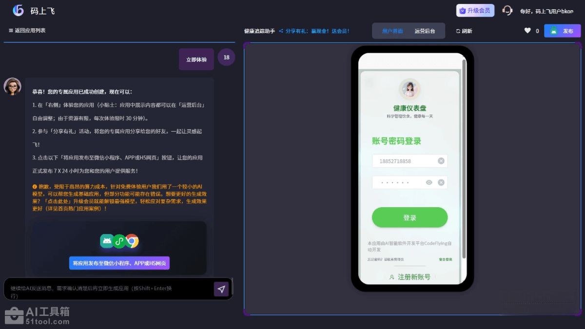 码上飞(CodeFlying)是跨赴科技推出的零代码AI应用开发平台,用户只需一句话简单描述需求,AI能自动生成小程序、APP或H5网页应用,无需编写代码。码上飞支持一键发布到多个平台,如小程序、安卓、鸿蒙OS等,并提供独立的后台管理系统,方便用户运营和管理。
