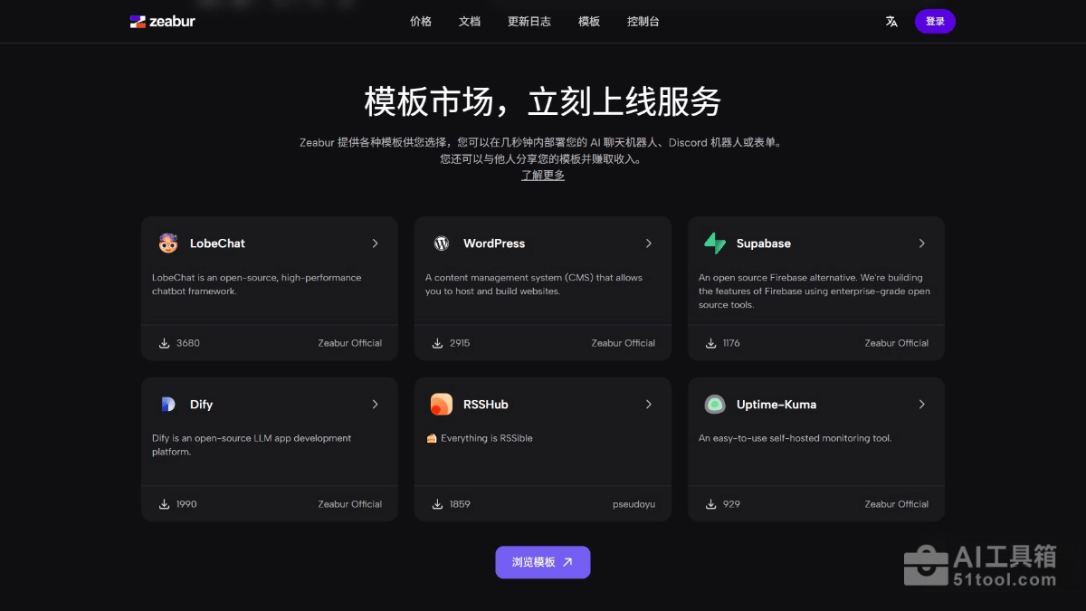 • 模板市场:提供多种预设模板,用户能快速部署常见的服务,如 AI 聊天机器人、WordPress 等。
