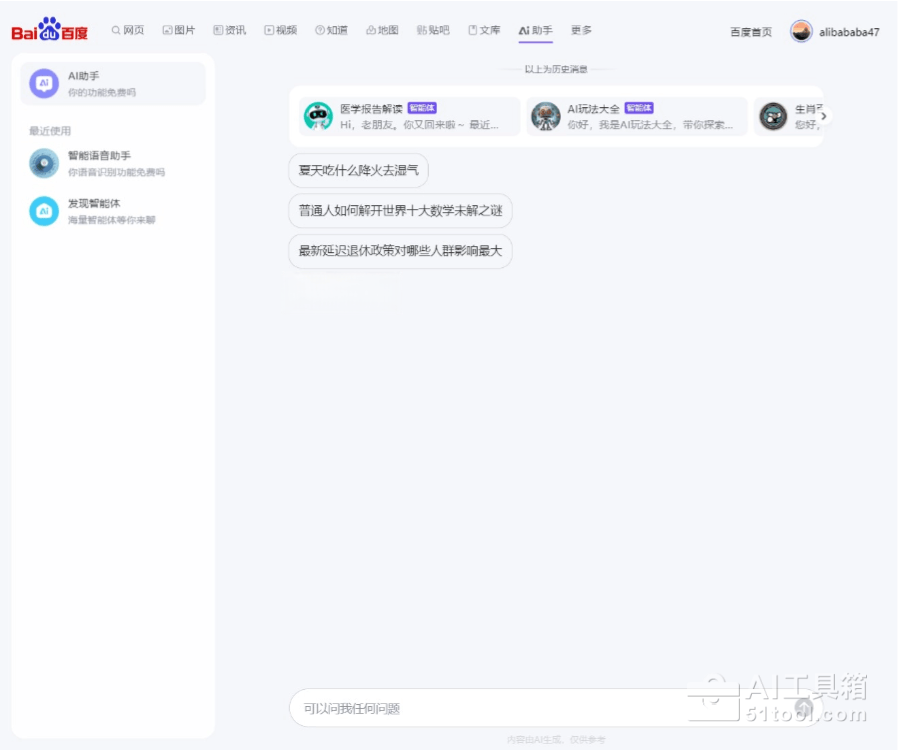 chat.baidu.com。其功能也已深度集成到百度搜索主站及百度App中。 - 开始使用:需要使用百度账号登录。登录后,在“智能框”中输入问题、上传文件,或使用语音、图片等方式提问即可。