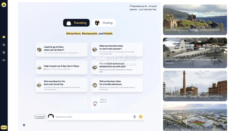 - 个性化旅行规划:用户可以通过与聊天机器人对话,输入旅行偏好、目的地或需求,获得定制化的行程推荐。Wanderboat 会根据用户的需求提供深入回应和个性化建议。