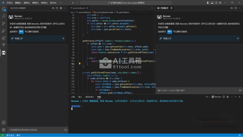 - 在代码编辑器里面使用Alt + /可获取代码补全,也可以在侧边栏获终端面板唤起代码助手进行对话