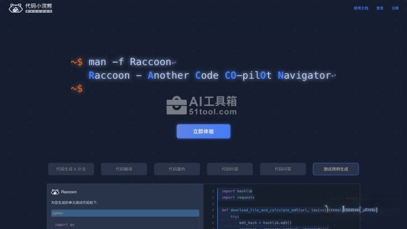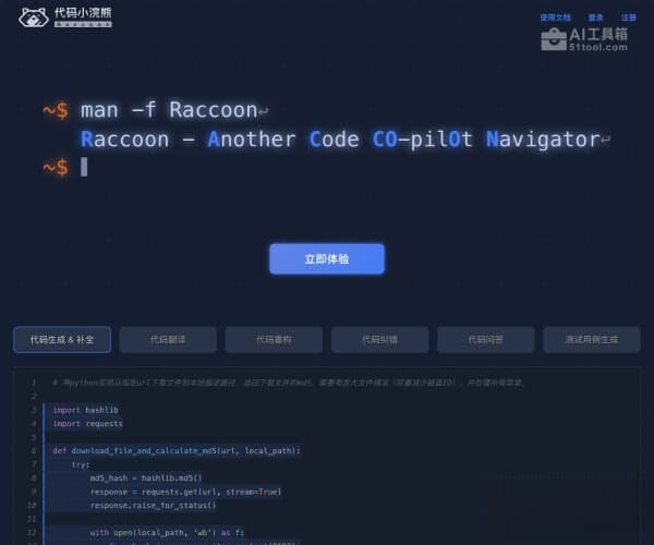 - 访问代码小浣熊Raccoon的官网(xiaohuanxiong.com/code),点击立即体验按钮