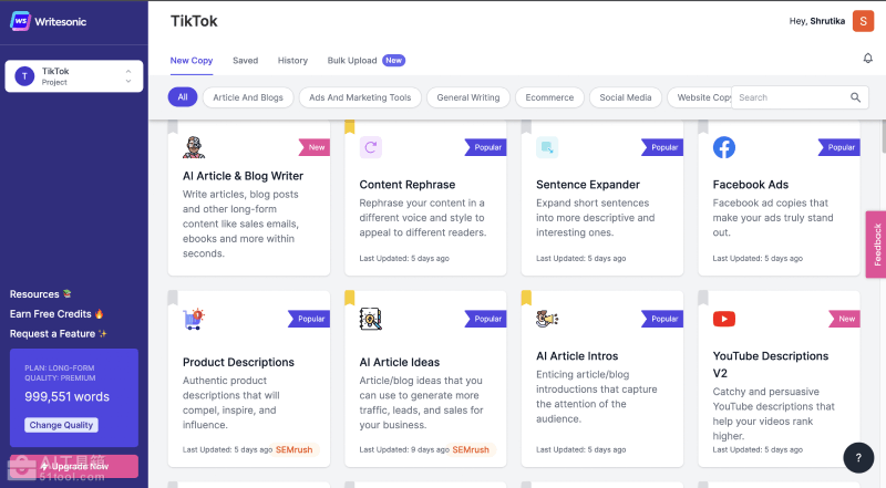 Writesonic是一个AI智能写作工具,用户可以使用该AI写作工具输入文本提示,生成无限的内容以节省时间和精力。该平台内置了65个以上的文章模板和功能,如文章写作、Facebook广告、着陆页文案、Quora回答、Twitter推文和Instagram标题等,帮助你高效率创作不同类型的内容。