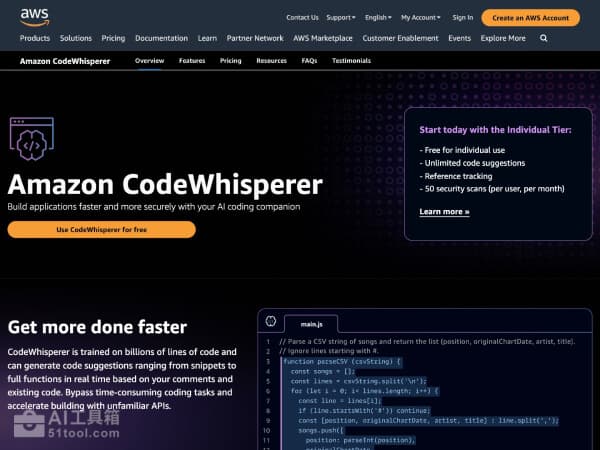 - 对于个人开发人员,可以免费使用 CodeWhisperer,支持不限次数地生成代码建议并免费使用引用跟踪器,且每月可免费进行 50 次代码扫描。