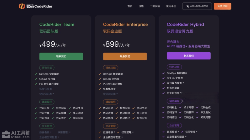 - CodeRider Team驭码团队版:面向团队的版本,每年每人的价格是499元人民币。这个版本提供了一系列的特色功能,包括DevOps智能辅助、GitLab文档库、PC原生算力模型和私有化部署。此外,它还包括辅助编程、代码补全、技术问答、代码生成、代码注释、代码解释、单元测试、代码修改、代码优化和知识问答等辅助功能,以帮助团队成员提高开发效率。