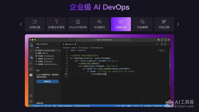 驭码CodeRider是极狐GitLab推出的AI编程与软件智能研发助手,专为提升程序员的编码效率和研发效能而设计。该AI编程工具基于AIGC技术,提供代码补全、生成、解释、单元测试生成以及智能问答等强大功能,支持PC原生端侧部署,允许用户在离线状态下使用,同时提供私有化部署选项,确保企业数据安全。驭码CodeRider与GitLab深度集成,支持智能DevOps工作流,帮助处理议题、合并请求,并与CI/CD流程结合,实现端到端的AI赋能。此外,它还覆盖了近百种编程语言,支持主流IDE集成,是企业级AI DevOps解决方案的优选。