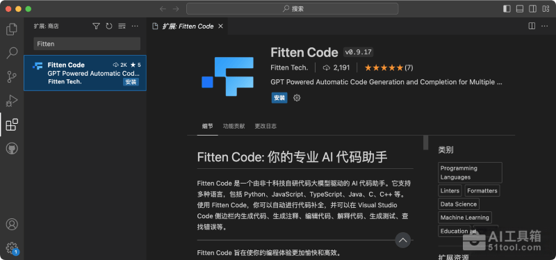 - 在搜索框中输入Fitten Code进行搜索,然后点击安装