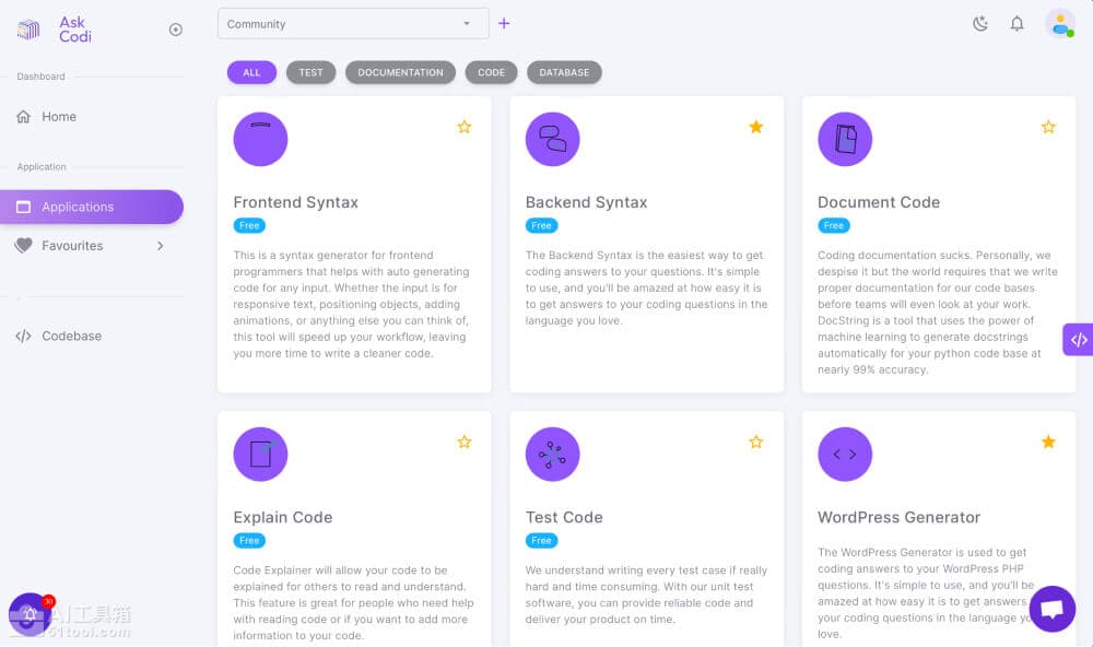 AskCodi是一个基于AI的代码生成助手,该工具理论上可以帮助你完成任何编码工作。从生成代码到解释代码背后的逻辑,从开发WordPress网站到创建一个应用程序,甚至重构你现有的代码,Codi将是你整个编码之旅的伴侣。