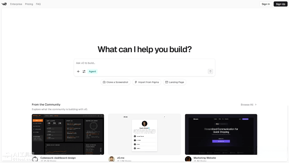 - 全栈应用开发:v0 支持从前端到后端的全栈开发,包括代码生成、数据库集成和外部 API 调用,适合开发复杂系统。
