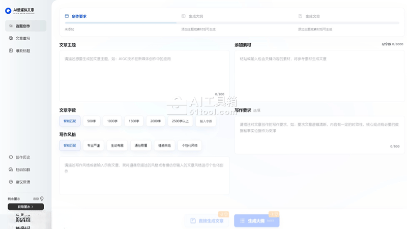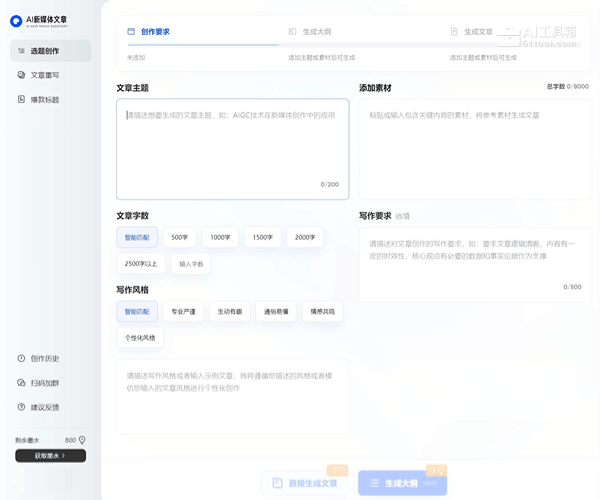 - 一键生成高质量原创文章:结合选题、重写和标题生成功能,一键生成符合要求的文章,节省时间,提高效率。