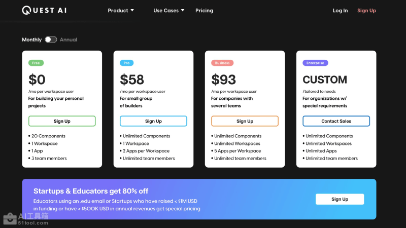 Quest AI提供不同的定价计划以满足不同的项目需求,初创企业和教育邮箱可获得80%折扣