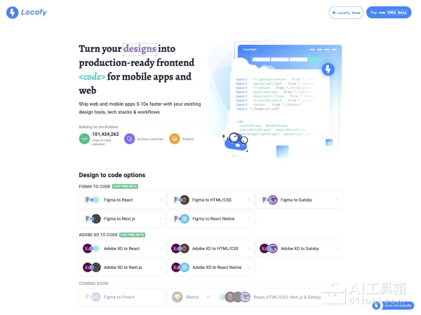 Locofy基于人工智能技术提供了一种将设计转换为代码的服务,Locoy.ai的目标是在不增加复杂性的情况下消除工程师的琐碎工作,即从前端代码开始自动化50%或更多的当前工作流程,使团队能够将他们的设计转换为代码和交互式、响应迅速的实时原型(在代码上运行),而无需编写一行代码。
