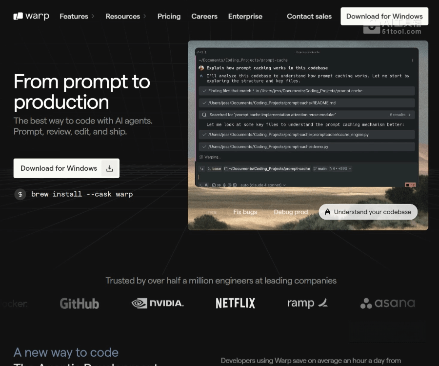 Warp 是现代化的开发环境工具,通过集成 AI 助手提升开发效率。支持从代码编写到生产的全流程,帮助开发者节省时间。通过自然语言指令生成代码,提供代码审查和优化建议。从代码编写、审查、部署到生产监控,Warp 覆盖整个软件生命周期。通过代码库嵌入和知识库,Warp 能理解代码上下文,提供更精准的建议。提供零数据保留(ZDR)和自带语言模型(BYO LLM)选项,确保数据安全。支持团队协作、SAML 单点登录和定制化 AI 请求,满足企业级需求。