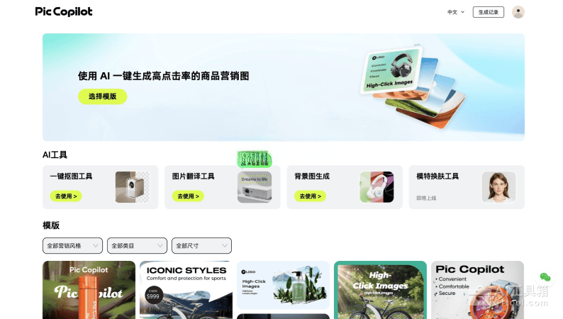 - AI生成商品营销图:提供多种营销风格、不同行业类目和尺寸的模板,点击一键即可生成商品营销图