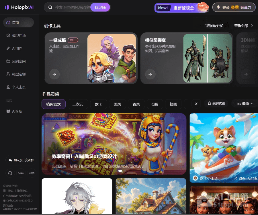 Holopix AI是广州光绘科技推出的专为游戏、动漫、插画设计打造的在线 AI 设计平台,提供文生图、线稿生图、色块生图、姿态生图、AI 图像风格转换、一键抠图、3D 视角转换等功能。Holopix AI支持中文生成,内置多种风格模型(如独立游戏、漫画、国风、欧美等),可自定义训练专属风格模型,确保视觉风格一致性。Holopix AI 提供智能编辑工具(如智能替换、局部细化、无损 4K 画质提升等),助力用户高效创作游戏角色、场景、ICON 及美宣插画等美术素材。