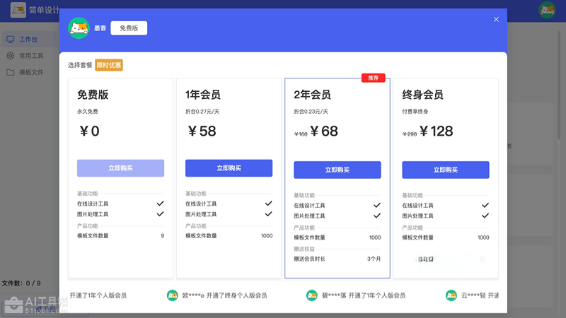 - 终身会员:128元,提供1000个模板文件和所有设计、图片处理工具。