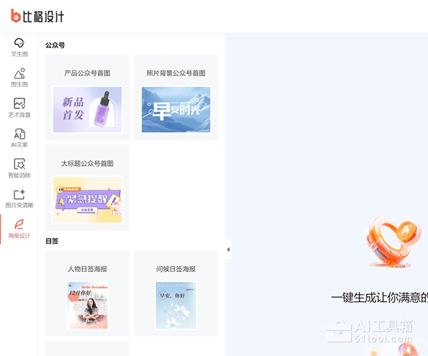 笔格设计(原比格设计)是一款高效的AI图片设计工具,能够根据用户输入的描述词或上传的图片,自动生成具有特定风格和尺寸的图片。主要功能包括文生图、图生图、艺术背景生成、AI文案创作、智能图片消除、图片清晰度提升以及海报设计等。