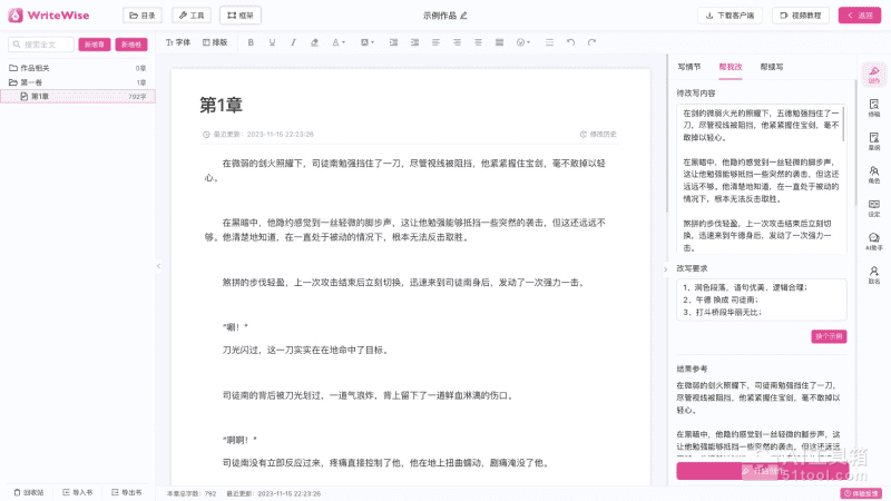 - AI创作辅助:提供情节描述、内容改写和基于前置内容改写段落