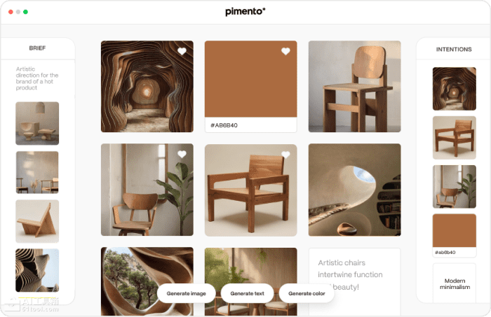 Pimento是一个由生成式人工智能驱动的设计创意和视觉参考平台,该工具更加专注于设计的初始阶段,即创意构思、头脑风暴、情绪/灵感板,将用户输入的指令与AI模型相结合使用,快速生成图像、文本效果和色彩等激发创意,为设计项目和团队提供灵感和指南。Pimento提供用户友好的协作和创作界面,可帮助创意人员、艺术工作室、设计机构、营销团队实现更多、更高效的创意迭代,目前Pimento处于内测中,用户可访问官网免费申请。