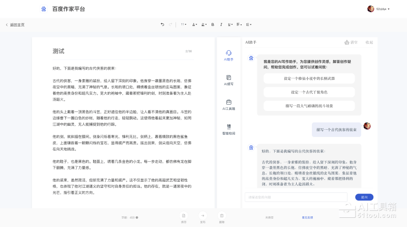 百度作家平台是百度官方推出的一站式AI辅助创作平台,提供丰富多样的AI创作功能,帮助内容创作者写出更多好作品。