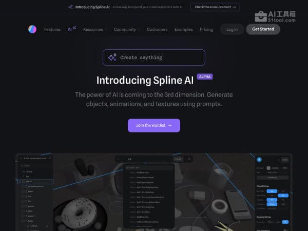 Spline是一款基于浏览器的免费在线3D编辑器,该网站基于Stable Diffusion v2的AI生成技术,推出了Spline AI,该AI 3D设计工具允许用户输入文本自动创建和生成3D物体、动画、材质等,以加速3D设计人员的设计速度。
