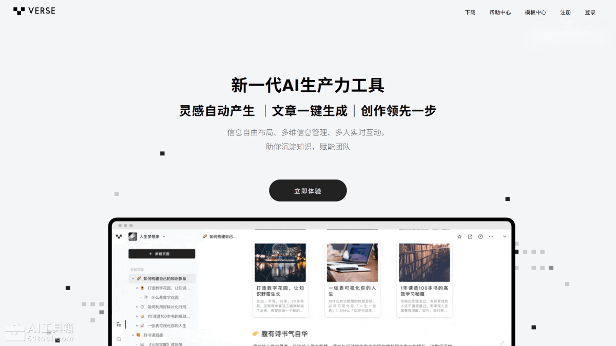 Verse 是印象笔记推出的集成了 AI 技术的写作与文档管理工具。支持信息自由布局与多维标签管理,用户可以通过自由拖拽元素实现个性化信息布局,通过多维标签体系与全端搜索功能,实现碎片化信息的结构化存储。Verse 的 AI 写作辅助功能强大,能智能生成文章框架、自动提炼灵感,提供会议纪要、公文假条、小说作文、工作日报、新闻稿、广告创作等多场景内容智能生成。用户只需在页面中点击“AI 帮我写”,输入想要创作的标题或简要描述可快速生成文字内容。Verse 支持多人实时协作,实时查看彼此的修改内容,进行讨论和沟通。实现与印象笔记家族产品的数据互通及实时同步,覆盖桌面端、移动端和网页端等多种平台,用户可以在不同设备上随时随地访问和使用。