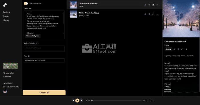 3. 输入完成后点击Create音乐,稍等片刻即可生成歌曲