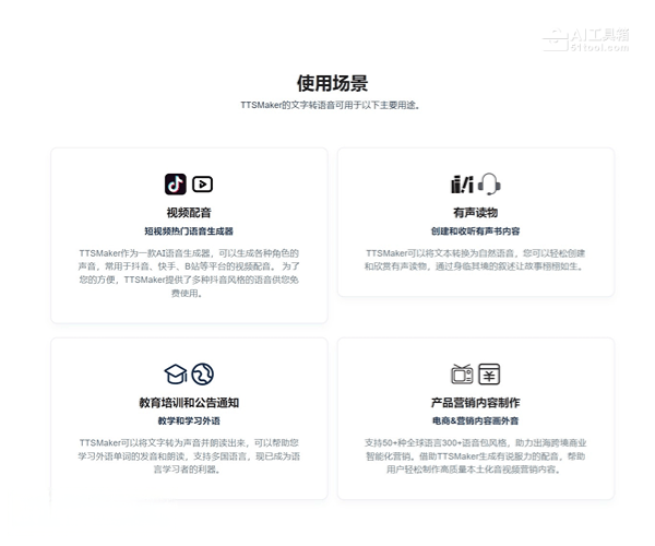 TTSMaker是马克配音(MakVoice)推出的免费AI文字转语音工具,提供多语言和多种语音风格的AI配音服务。用户可以输入文本,选择语言和声音,然后一键转换成自然流畅的语音。平台支持50+语种和300+语音包,满足个性化配音需求。TTSMaker还提供高级设置,如调节语速和音调,以及变声和插入停顿功能。用户可以免费使用,拥有合成音频的100%版权,适用于视频配音、有声读物、教育培训等场景。TTSMaker还提供API服务和用户支持,确保使用便捷和隐私安全。