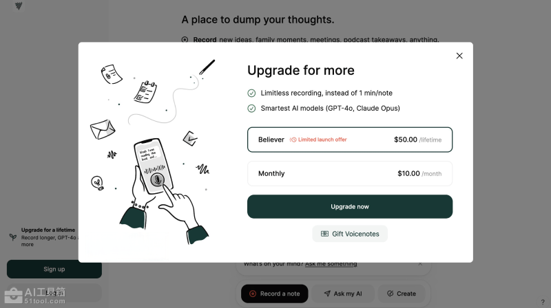 - 付费版:50美元终身、10美元每月,付费后不限制录制时间,且能使用GPT-4o、Claude Opus等更强大的模型