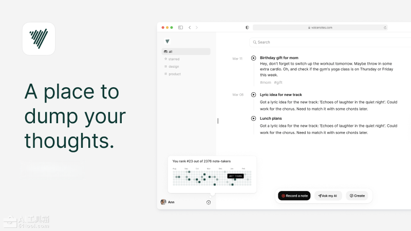 - 个性化AI助手:Voicenotes的AI助手可以根据用户的使用习惯和偏好提供个性化服务,如笔记互动、智能提醒、内容推荐等。
