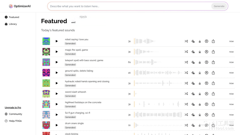 - 文本到声音效果生成:Optimizer AI可以根据用户的文字提示生成各种声音效果,适用于不同的场景和应用,如游戏中的射击声、跳跃声,动画中的环境音效等。