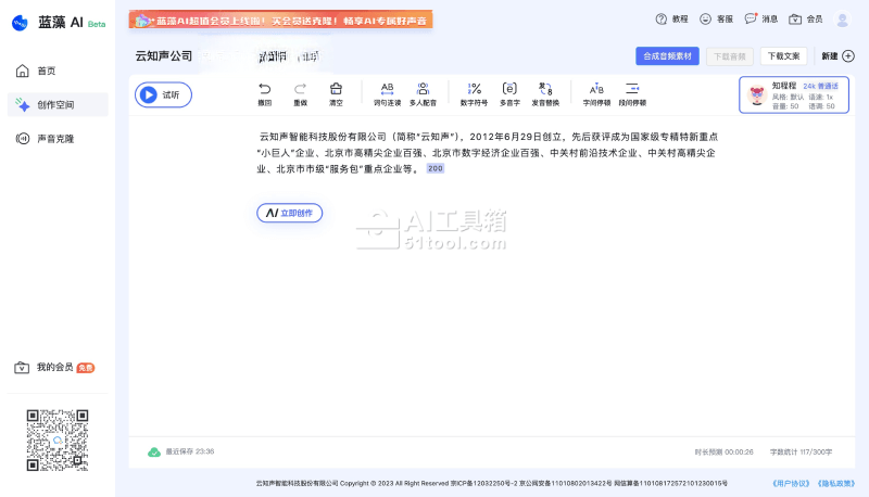 - 创作字数包:付费会员可购买音频合成字数包,价格为5元1万字、25元5万字、45元10万字、120元30万字、210元60万字、360元120万字