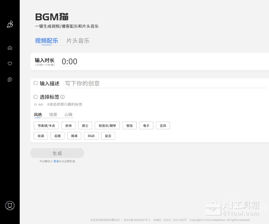 - 智能生成:用户输入音乐的时长和相关标签,如场景、风格、心情等,BGM猫能自动生成与之匹配的背景音乐。