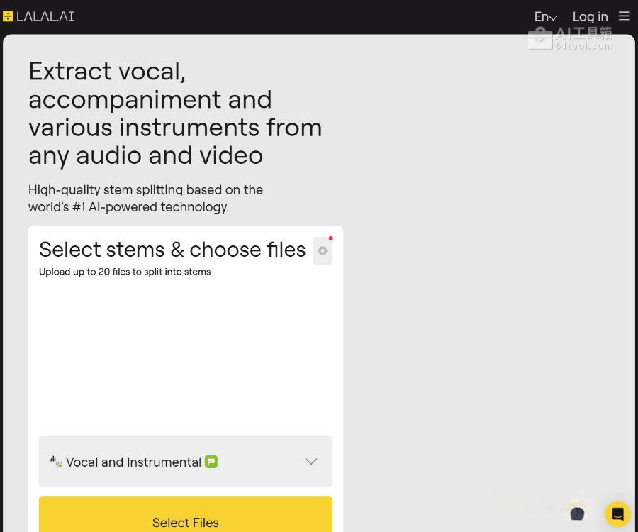 LALAL.AI是AI音乐音频处理工具,能快速、精准地将音频或视频中的人声、伴奏、鼓、贝斯等不同音轨分离,支持多种音频和视频格式(如MP3、WAV、MP4等)。工具提供免费的批量上传功能,用户能上传多达20个文件进行处理。LALAL.AI具备去除回音、混响和降噪等功能,能有效提升音频处理质量。工具提供数字声音克隆功能,帮助用户创建个性化的数字声音副本。