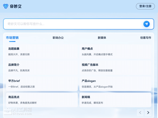 奇妙文是由出门问问推出的一个AI写作助手,可以帮助用户快速进行市场营销、职场办公、新媒体、创意写作等类型的智能内容创作。奇妙文灵活简洁的编辑模式支持续写、改写、扩写、缩写、提炼要点、风格转换、纠错、翻译八大 AI 写作功能,用户可以在写作过程中一键唤醒 AI 帮助自己创作,并且还能在写作中让 AI 自动生成图片,真正做到图文并茂、文思泉涌。