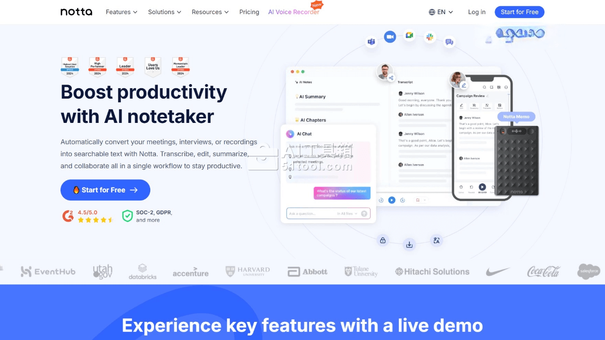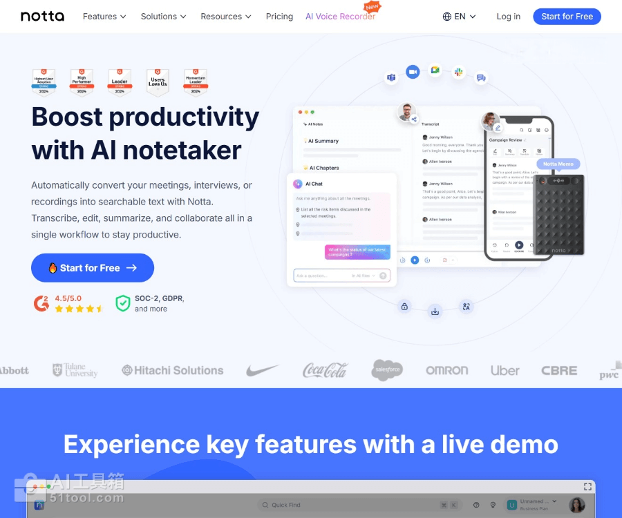 Notta是语音转文本工具,能将音频和视频内容实时转录成文字,支持多达 58 种语言。工具自动生成会议摘要、提取关键信息和行动项,将重要内容剪辑成片段分享给团队成员。Notta 具备会议录制、日程安排等功能,支持与 Slack、Salesforce、Notion 等多种常用工具无缝集成,极大地提升工作效率。Notta适用任何现代设备,如PC、智能手机和平板电脑,从麦克风转录在线会议、网页音频、音频文件和现场录音,Notta都能处理,是提升会议效率和团队协作的利器。